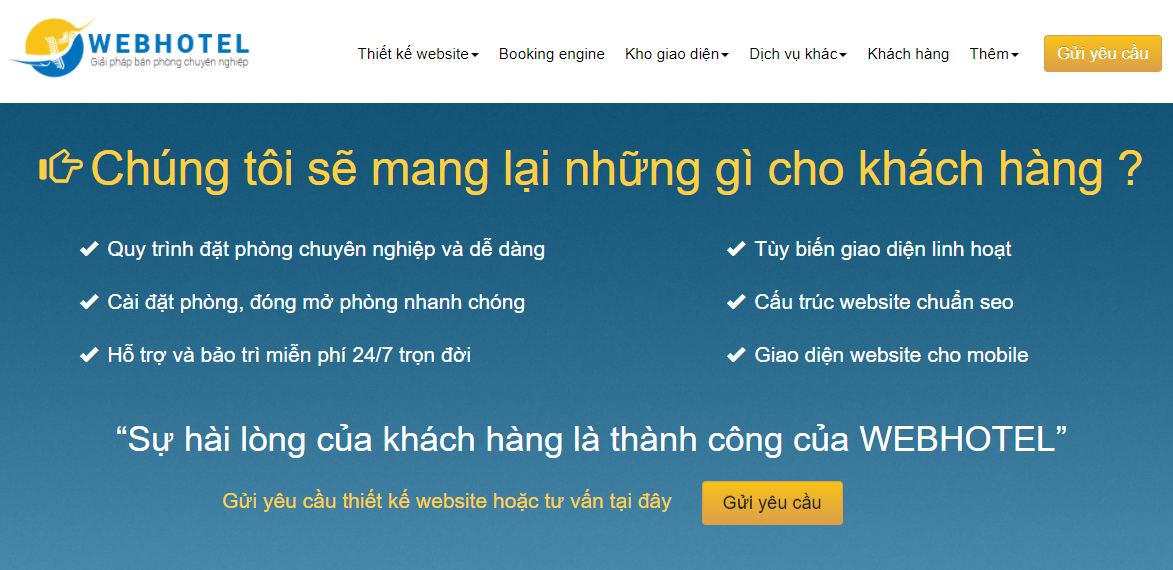 - Ngược lại, Webhotel với nhiều năm kinh nghiệm về thiết kế web cho khối dịch vụ nhà hàng, khách sạn, resort, chúng tôi luôn nghiên cứu những gì thị trường cần, nắm bắt xu hướng thiết kế mới nhất, cũng như hiểu được thị hiếu mà du khách đang quan tâm để tạo ra những sản phẩm web uy tín, chất lượng.