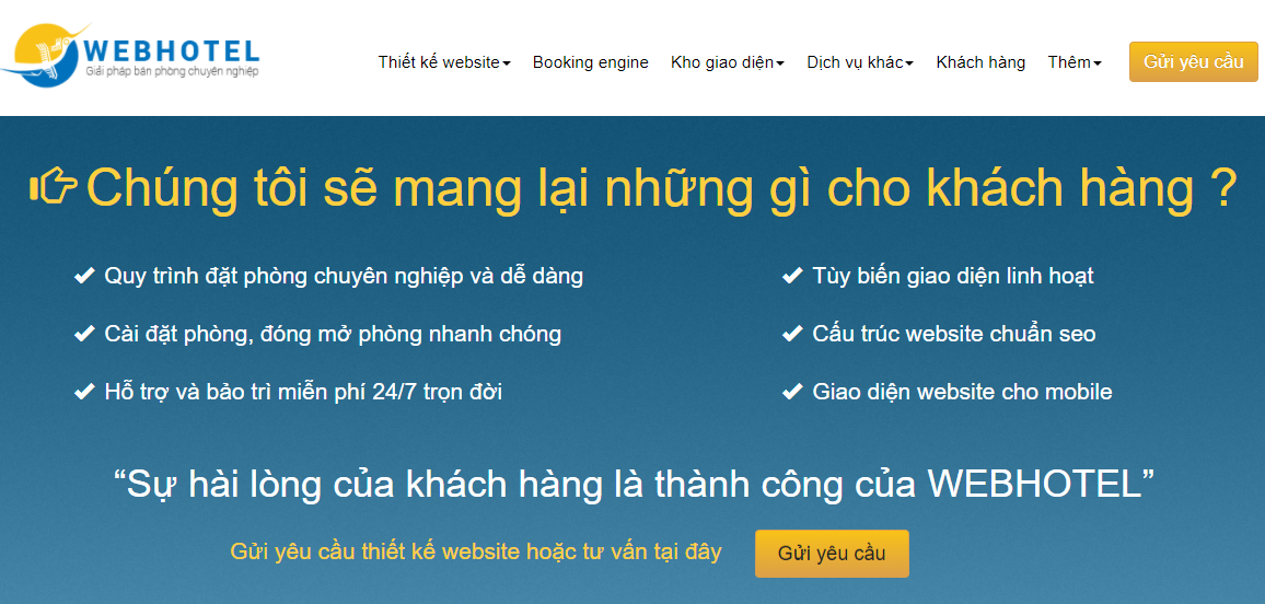 Ấn tượng ban đầu là vô cùng quan trọng nhưng không đồng nghĩa với việc bạn có thể thuyết phục khách hàng mua sản phẩm. Đó là lúc bạn cần một website chuyên nghiệp để có thể đáp ứng mọi nhu cầu của người dùng từ việc di chuyển tới các tính năng cần thiết và đặc biệt là quá trình đặt phòng trực tuyến đơn giản và dễ thực hiện.
