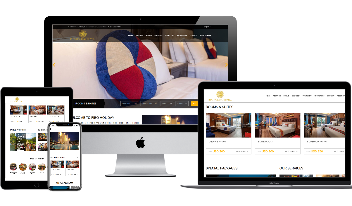 - Giao diện thiết kế độc đáo, thu hút, thể hiện đẳng cấp, phong cách và hình ảnh cũng như nét thu hút riêng của khách sạn bạn.