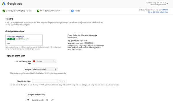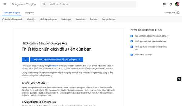 Bạn chỉ cần truy cập vào website Google Adwords và đăng ký với tài khoản Google của bạn. Sau đó hãy điền tất cả các thông tin cần thiết.Và tiếp tục các bước tiếp theo để tạo nên một chiến dịch đầu tiên của bạn. Để hoàn thành một chiến dịch quảng cáo Google AdWords thì cần qua các bước: chọn ngân sách, đối tượng tập trung, đặt giá thầu và viết nội dung quảng cáo. Tất cả các nội dung này bạn cần cân nhắc để có được một chiến dịch chạy quảng cáo Google AdWords tối ưu, hiệu quả.